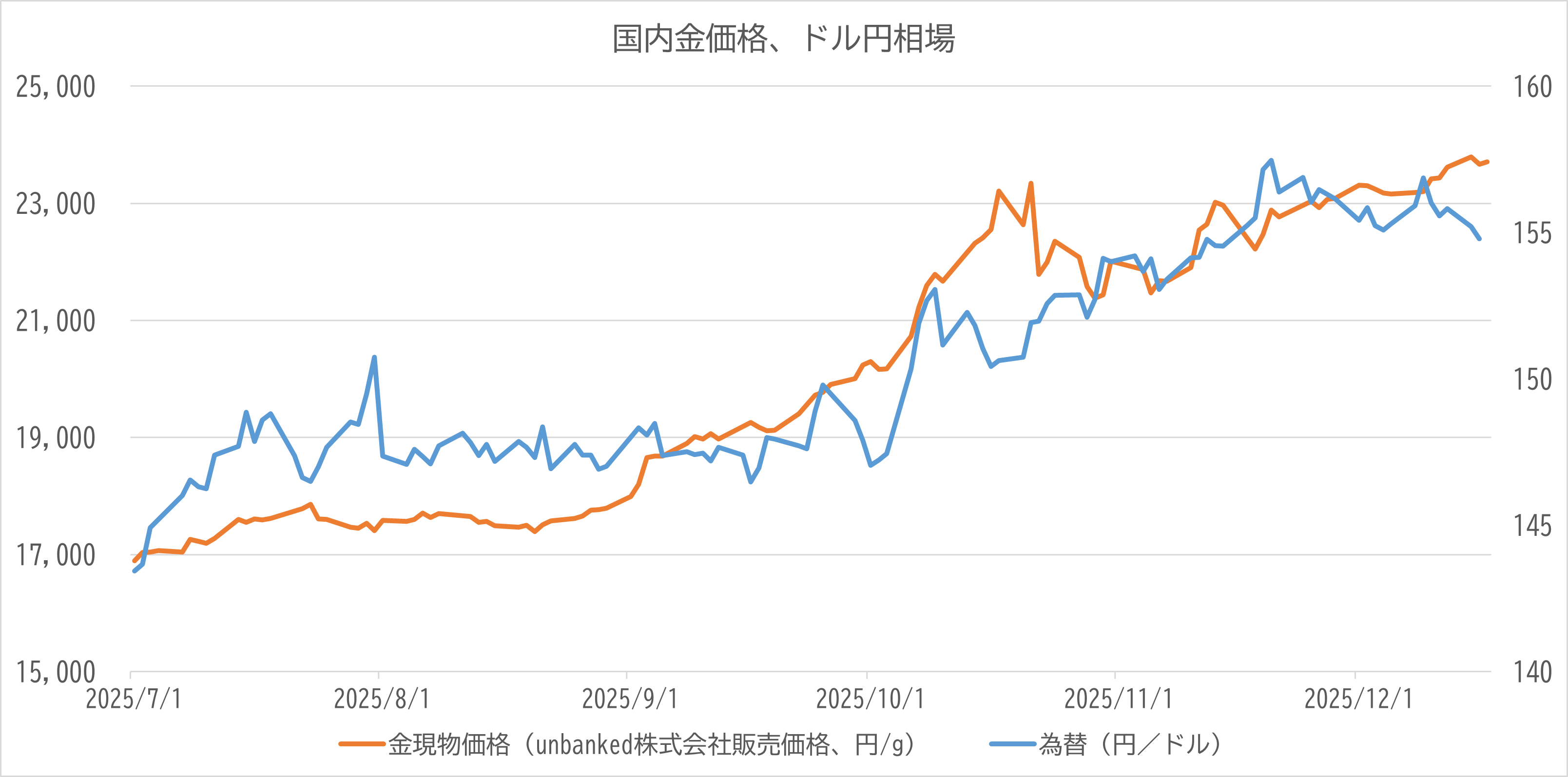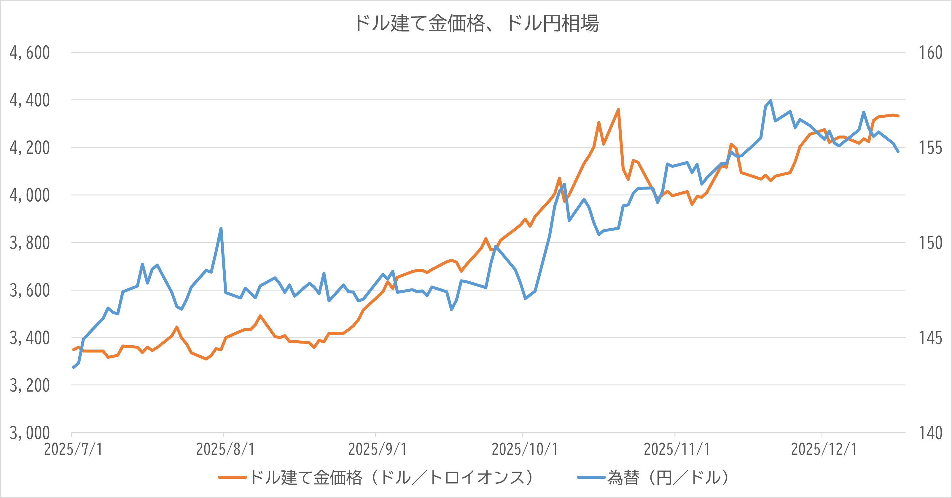 通常、金価格(ドル建て)が上昇する局面では、ドルの価値が相対的に低下している(ドル安)ことが多く、その場合、円高ドル安が進行して国内金価格の上昇を相殺する傾向があります。しかし2025年は、米国の金利が高止まりしドルが底堅さを維持する中で、金価格が独自に上昇するという特異な相場展開となった。その結果、円建ての金価格は、ドル建ての上昇率に円安分が上乗せされる形で暴騰しました。