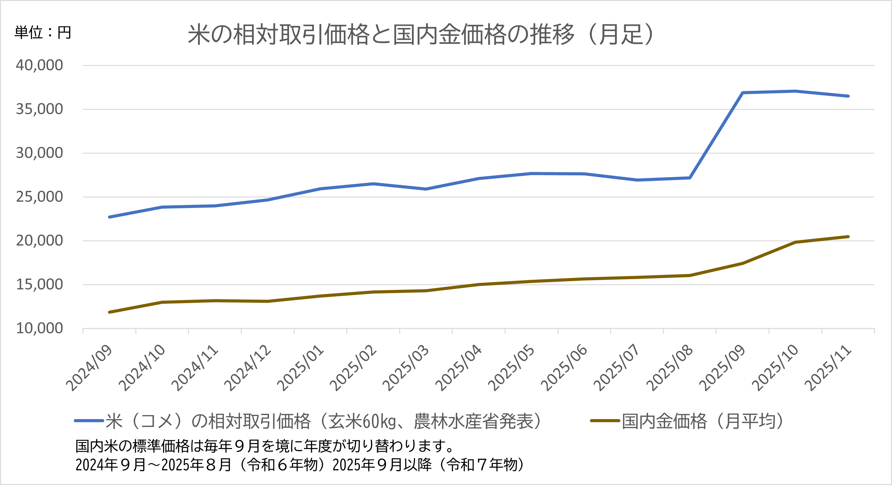 2025年11月、コメの相対取引価格は玄米60kgあたり36,493円となり、1990年以降で過去最高値を記録しました。同時期に、金地金はグラムあたり23,000円台と過去最高値圏に浮上します。この二つの出来事は、表面的には「不作の余波」と「有事の金」という別個の理由で語られますが、これらはより深いところでは、政治リスクの具体化というグローバルな潮流と、日本国内の硬直的な流通構造が引き起こした人為的なインフレが交錯した結果と考えられています。