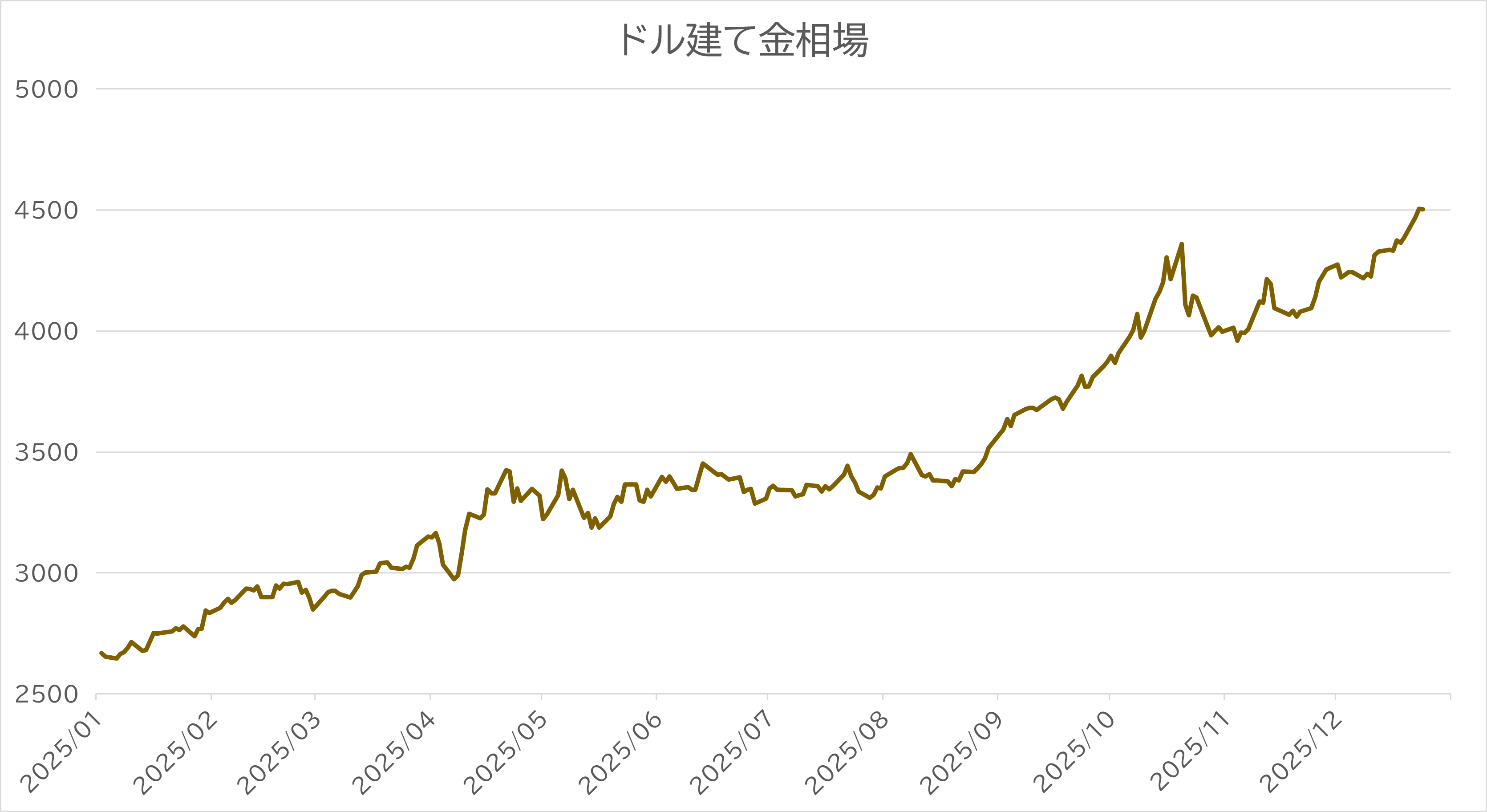 2025年のドル建て金相場は、年末にかけて上昇を続け、2025年12月24日には史上初となる4500ドル/トロイオンスを記録しました。大手金融機関の多くは来年2026年にドル建て金価格は5,000ドルの大台に達すると見込んでいますが、予想よりも遥かに早いペースで金相場は上昇しています。