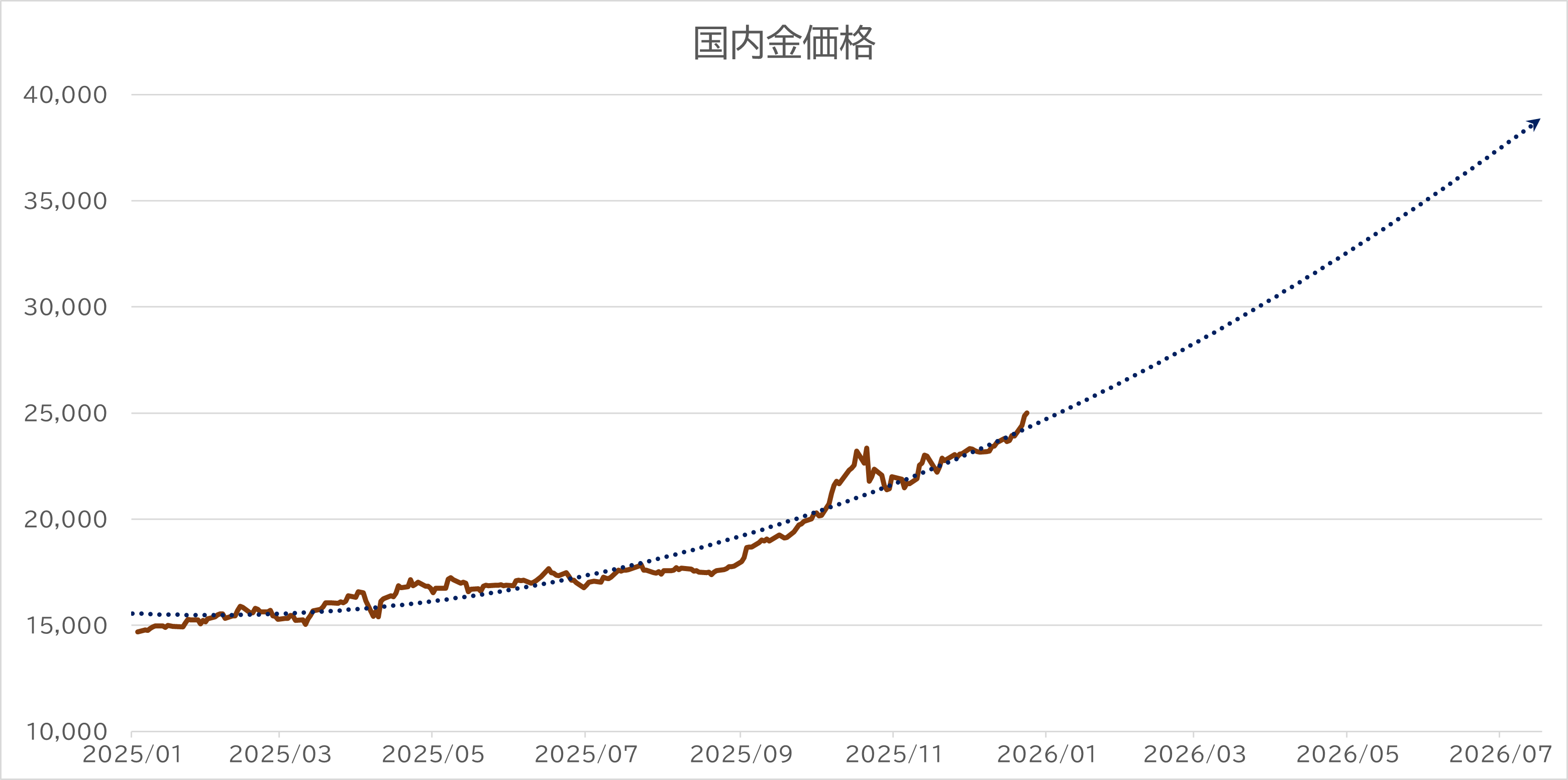 また、2026年には金融システム内部に蓄積されたリスク、特に投資ファンドによる直接融資である「プライベート・クレジット」分野での不良債権化が表面化するリスクも指摘されています。低金利時代に急拡大したこの市場で信用収縮が発生すれば、伝統的な金融機関にも波及し、2008年のリーマン・ショックのような流動性危機とは異なる、より根深い構造的な信用危機に発展する可能性があります。こうした状況下で、カウンターパーティー・リスクのない金は、唯一の「逃避先」としてその輝きを増すことになるでしょう。仮に、ドル建て金価格が6,000ドル、円相場が1ドル=165円となれば、国内金価格は、約35,000円/gが換算値となります。2024年の時点では、まだ遠い将来の期待値と見做されていましたが、現在の上昇率を加味すると、今は否定できない水準と言えます。
