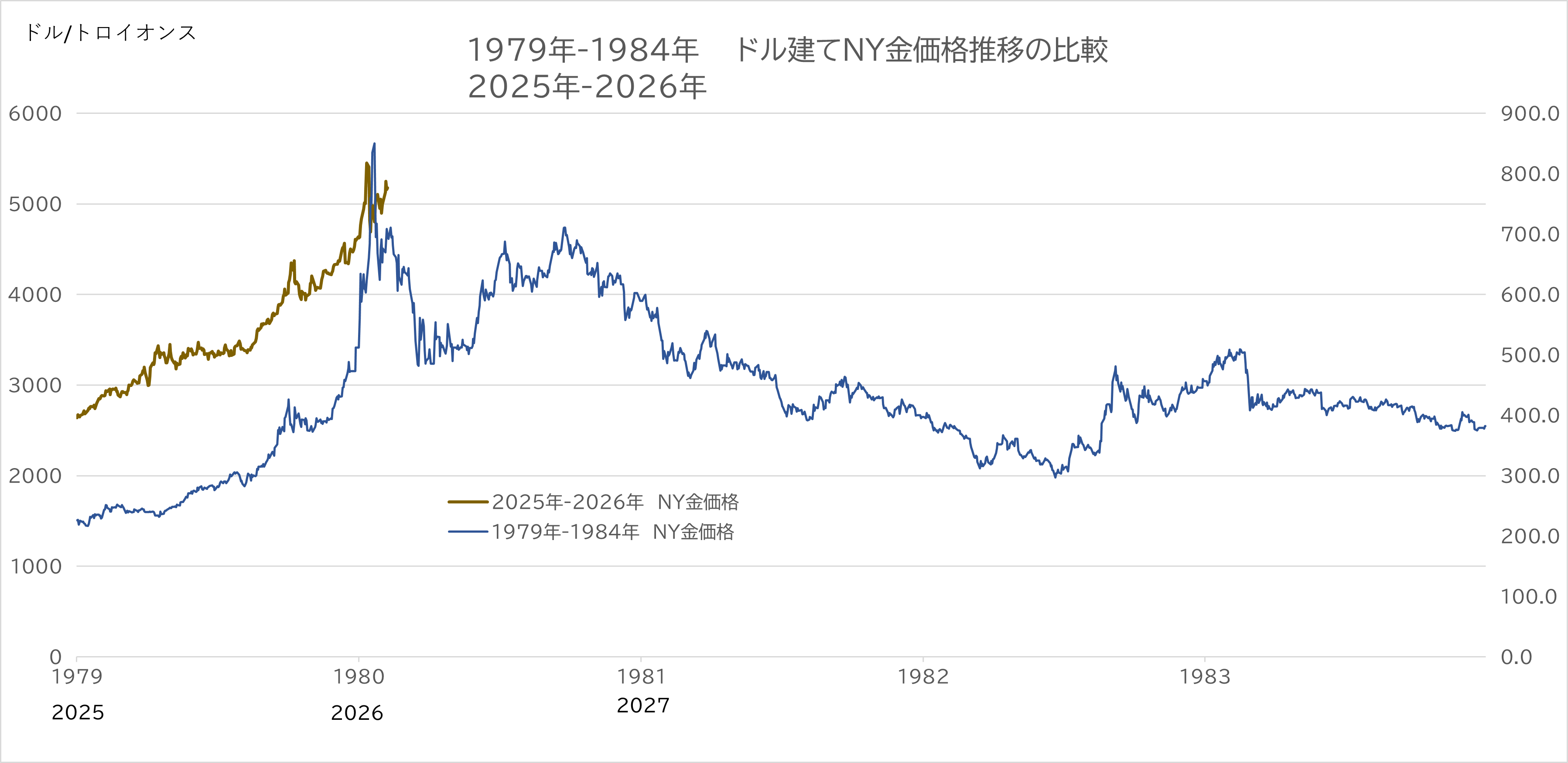 1980年にドル建て金相場は1979年初頭の200ドル強から800ドルを超える急騰となりましたが、買い一巡後は急落しました。2025年以降のドル建てNY金価格の推移は、1979年の歴史的な大相場で見られた「上昇→一時的な調整→急騰」というパターンが高い精度で再現されています。